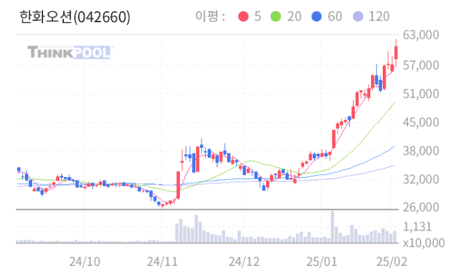 2024년 1월부터 3월까지의 한화오션 주가는 지속적인 상승세를 보였습니다. 특히, 2025년 1월 중순 이후로는 더욱 가파른 상승세를 기록하고 있습니다. 이러한 주가 상승은 여러 요인에 기인하고 있으며, 앞으로의 전망도 밝은 편입니다.