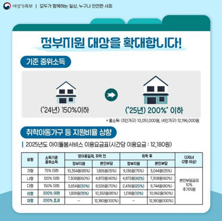 2025년도 아이돌봄서비스 이용요금표(시간당 이용요금: 12,180원)