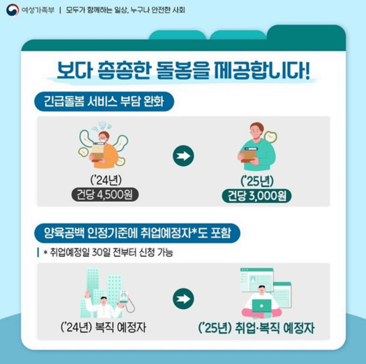 - 시간당 돌봄수당: ('24년) 11,630원 → ('25년) 12,180원